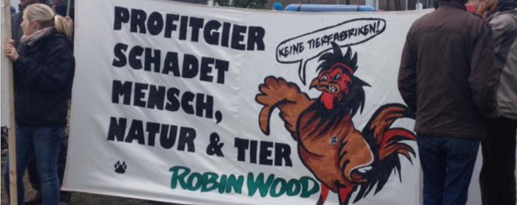 Um gegen Massentierhaltungs- und Verarbeitungsanlagen ein klares Stopp-Signal zu setzen, demonstrieren seit heute früh um 9 Uhr rund 70 AktivistInnen verschiedener Umwelt- und Tierrechtsgruppen sowie Bürgerinitiativen vor einer Wiesenhof-Schlachtanlage im brandenburgischen Königs Wusterhausen. ROBIN WOOD-AktivistInnen beteiligen sich an der Kundgebung vor der Anlage und haben ein Banner entrollt mit dem Slogan „Profitgier schadet Mensch, Natur und Tier“.