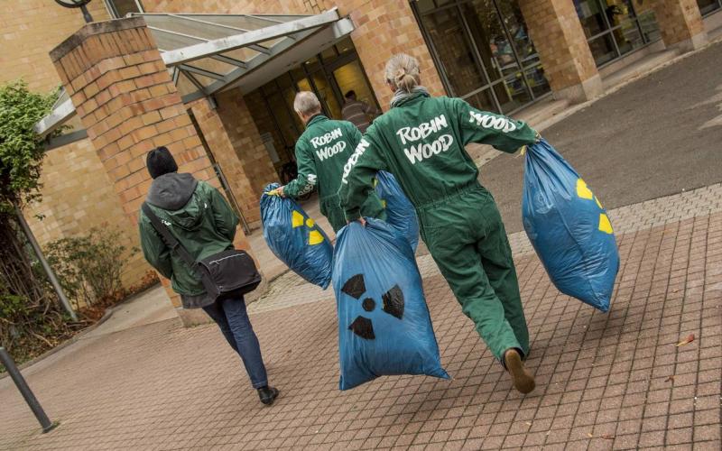 Am 15.10.2015 demonstrierten ROBIN WOOD-AktivistInnen am Umweltministerium. Es ging darum zu verdeutlichen, dass trotz der immensen Risiken noch immer in großen Mengen Atommüll produziert wird.