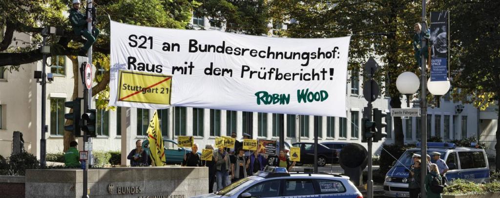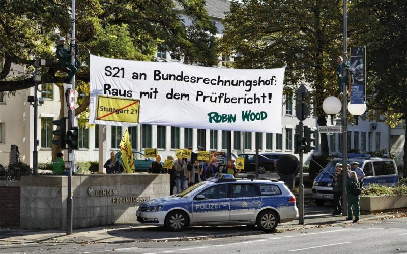 Kletterer der Umweltorganisation ROBIN WOOD haben heute Mittag vor dem Bundesrechnungshof in Bonn ein 14 Quadratmeter großes Transparent aufgehängt mit der Aufschrift: „Stuttgart 21 an Bundesrechnungshof: Raus mit dem Prüfbericht!“ Die Aktion ist Teil der heutigen Demonstration der Bewegung gegen Stuttgart 21. „ROBIN WOOD fordert, sofort Öffentlichkeit und Parlament über den Stand der Kostenschätzung des Bundesrechnungshofes zu Stuttgart 21 zu informieren“, erklärt Eberhard Linckh, ROBIN WOOD Stuttgart, vor Ort.