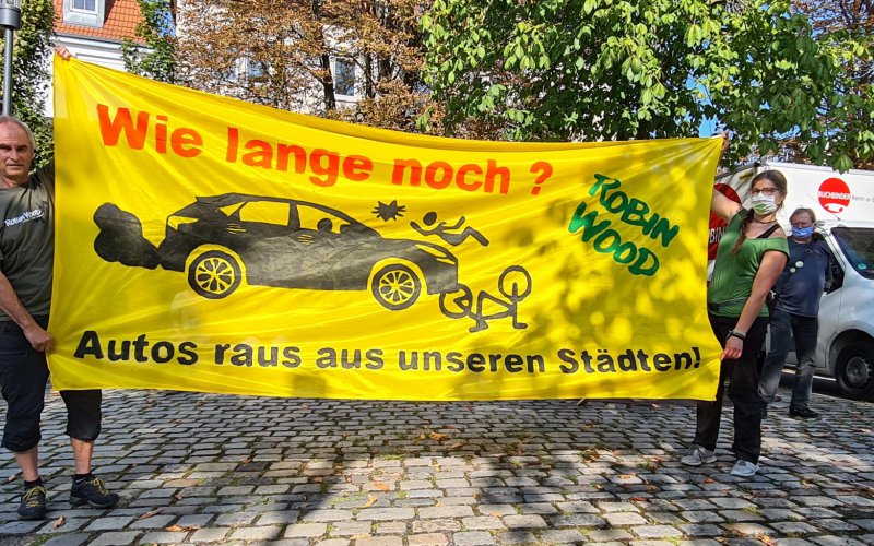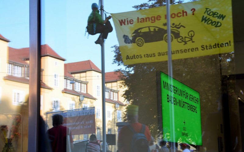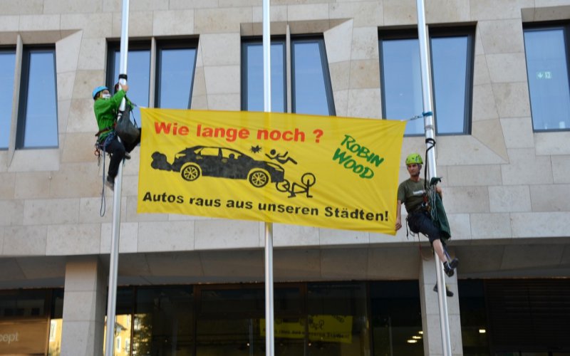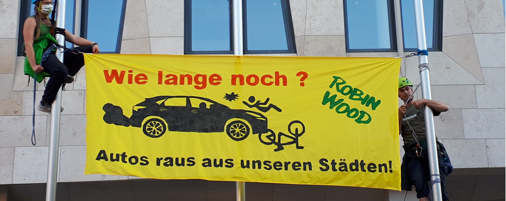 Während der Abschlusskundgebung entrollten Aktivist*innen der Stuttgarter ROBIN WOOD-Regionalgruppe vor dem baden-württembergischen Verkehrsministerium ein Banner mit dem Slogan „Wie lange noch? Autos raus aus unseren Städten!“. Sie fordern eine Abkehr von autozentrierter Stadtplanung und mehr Platz für Menschen statt für SUVs, die besonders zum Flächenfraß beitragen. Sie fordern außerdem ein Tempolimit von 30km/h für Autos in Städten und endlich entschlossenere Maßnahmen, um die vielen Verkehrsunfälle drastisch zu reduzieren.