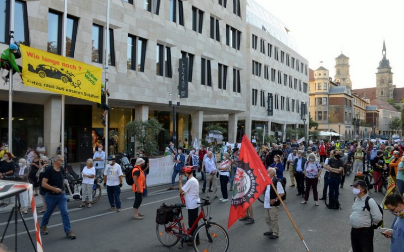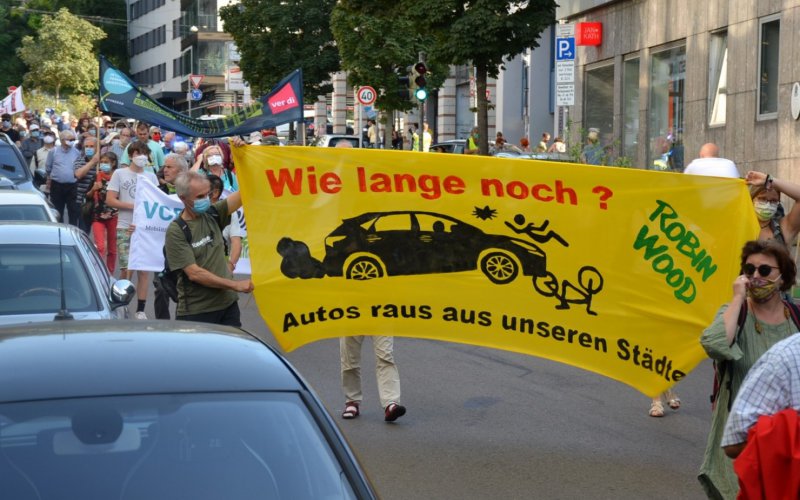 Unter dem Motto „Stadt für Menschen statt für Autos“ lief heute in Stuttgart eine Demonstration, zu der mehrere Umweltverbände aufgerufen hatten. Auch ROBIN WOOD Stuttgart war unter den aufrufenden Organisationen zur Demo, die im Rahmen der Europäischen Mobilitätswoche und dem so genannten PARKing Day stattfand. Es gab zwei Demozüge: eine Fahrrad- und eine Laufdemo, die sich um 17 Uhr am Charlottenplatz zu einer Kundgebung trafen. Mehr als 300 Menschen schlossen sich dem Protest an, um auf die zentrale Rolle der Verkehrswende für den Klimaschutz hinzuweisen.