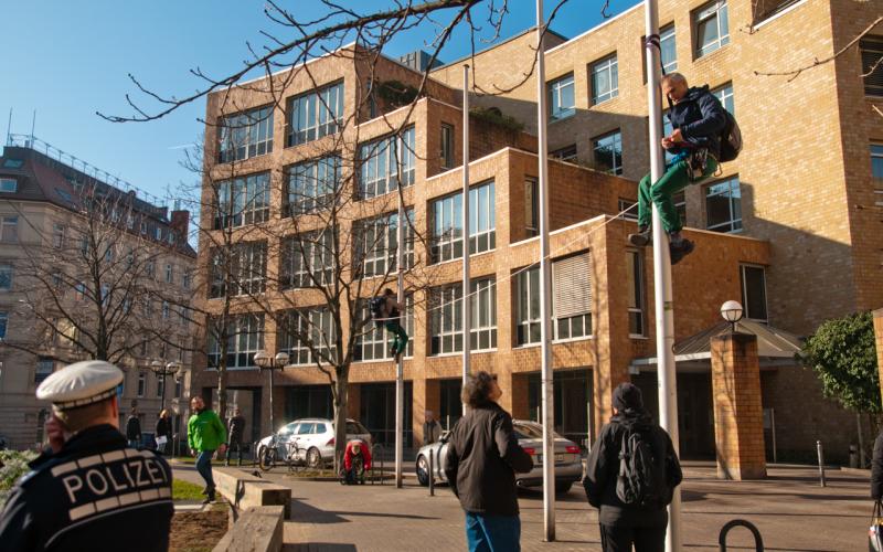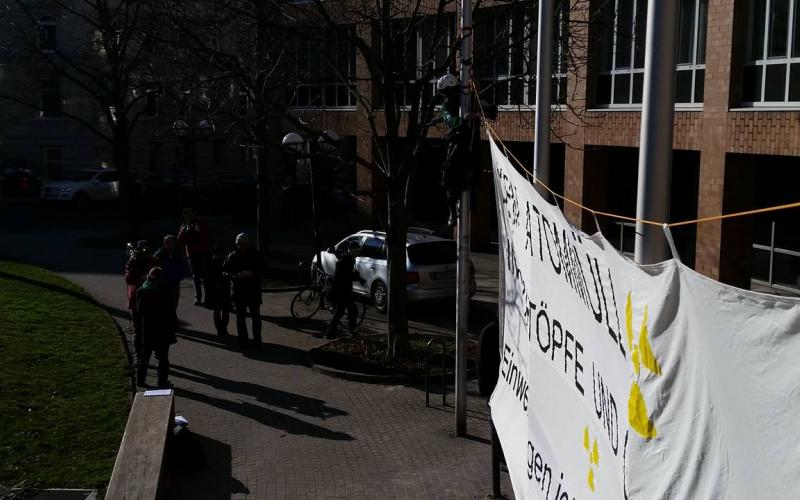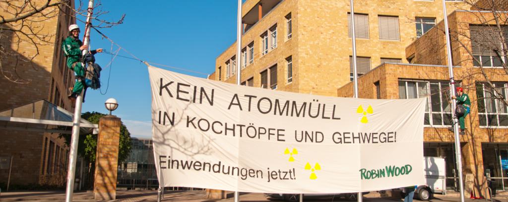Um 11 Uhr ist es soweit. Das Transparent mit der Aufschrift „Kein Atommüll in Kochtöpfe und Gehwege – Einwendungen jetzt!“ hängt vor dem Umweltministerium in Stuttgart. Die AktivistInnen freuen sich, auch wenn der Minister nicht für eine Stellungnahme zur Verfügung steht.