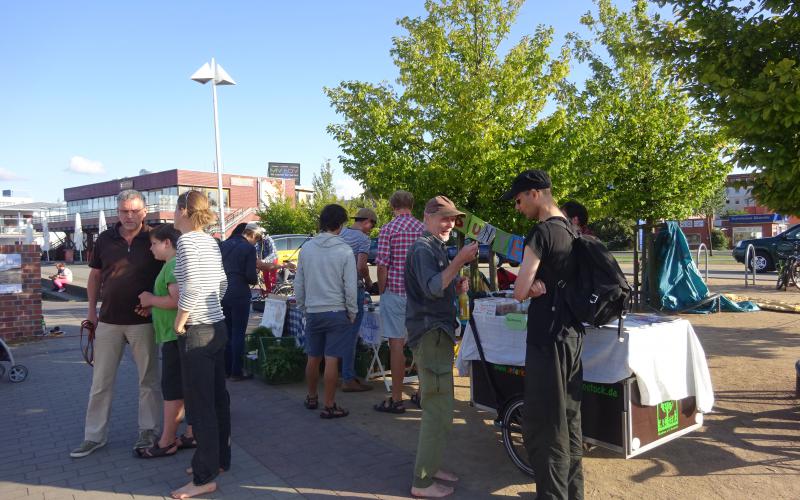 Vor dem Schiff wird es lebendig – der Markt der Alternativen baut auf. Verschiedene lokale Initiativen wie der Weltladen, die Bunten Höfe und der AK Backstube berichten von ihrer Arbeit und haben einige Kostproben dabei. Robin Wood ist ebenfalls mit einem Info-Stand am Start.