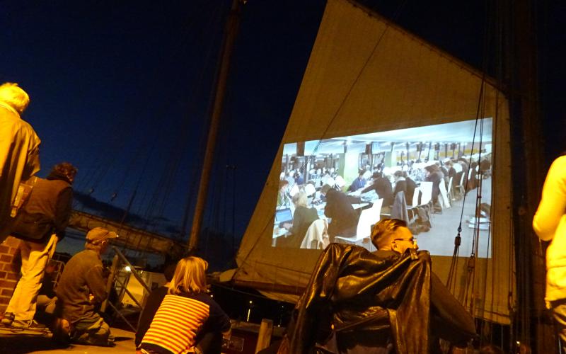 Danach geht’s ums Klima. Auf dem Schiff wird vom Klimacamp und den Aktionen im Rheinland berichtet und anschließend wird auf dem Großsegel des Schiffes der Film „Beyond the Red Lines“, ein Film über die Klimagerechtigkeitsbewegung gezeigt.