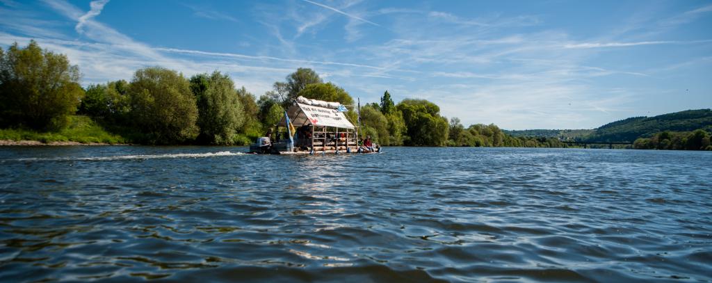 Das Aktionsfloß ROBINA WALD ist gerade auf dem Rhein unterwegs. Das Motto der Tour auf Mosel und Rhein: "Einfach mal abschalten - Urantransporte stoppen!"