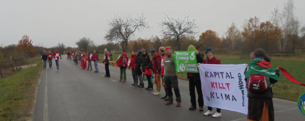 Anlässlich des Klimagipfels in Bonn haben Aktive von Robin Wood am Sonntag mit vielen anderen im Mitteldeutschen Braunkohlerevier für den Ausstieg aus der Kohle demonstriert. Insgesamt 260 Menschen zogen mit ihren Körpern eine symbolische Rote Linie zwischen dem Tagebau Vereinigtes Schleenhain und dem Dorf Pödelwitz, das für den Kohleabbau abgebaggert werden soll.