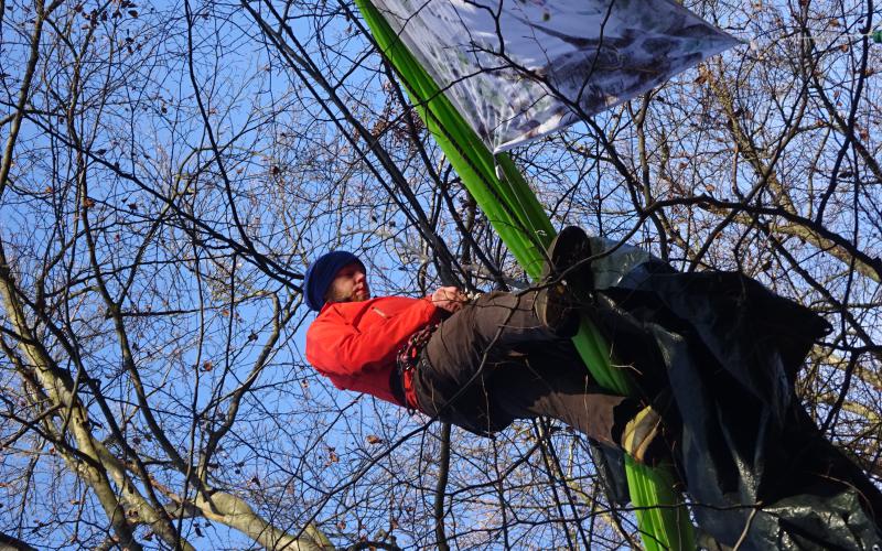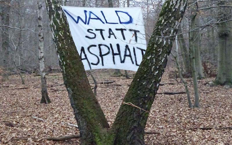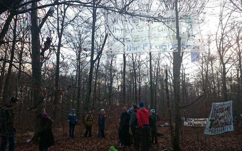 Neuer Graswurzelprotest wächst zurzeit im Waldcamp im Treburer Oberwald. Dort leben seit rund einer Woche freie Aktivist*innen und ROBIN WOOD-Aktive. Das Waldstück soll für einen Autobahnzubringer zum geplanten Terminal 3 zerstört werden.