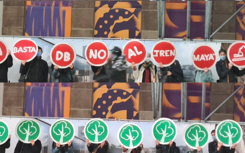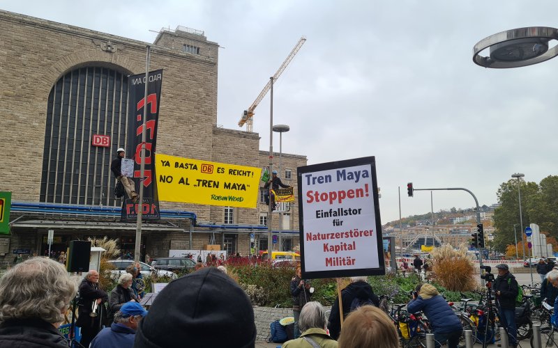 Der "Tren Maya", zu deutsch "Maya-Zug", ist ein Megainfrastrukturprojekt im Süden Mexikos, an dem sich zahlreiche deutsche Unternehmen, allen voran die Deutsche Bahn, aber auch Siemens, TÜV oder Heckler & Koch beteiligen. In ihrer Rede auf der Kundgebung in Stuttgart sagte die ROBIN WOOD-Aktivistin Angelika: "Wir stehen heute hier, weil sich der staatseigene DB-Konzern an einem gigantischen Projekt im Südosten Mexikos beteiligt. Das Schienen-, Autobahn- und Flughafen-Projekt wird von der mexikanischen Regierung 'Tren Maya' genannt und schon das ist ein Begriff, gegen den sich die indigenen Menschen und Organisationen vor Ort wehren und den auch wir ablehnen. Es ist ein Name, der die Rechte der indigenen Menschen und die jahrtausendealten Kultur der Maya missachtet."