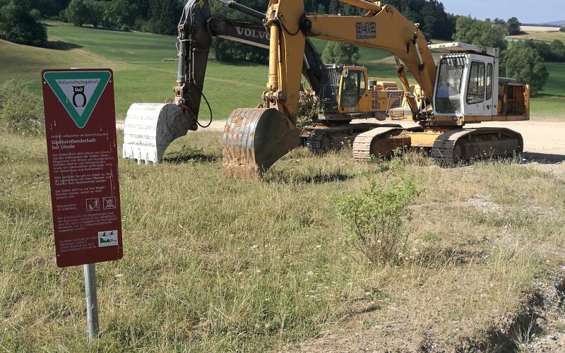 In der Landschaft reiht sich ein Naturkleinod an das nächste: Kalk-Pionierrasen, artenreiche Halbtrocken- und Trockenrasen und auch seltene naturnahe Wälder, zum Beispiel Orchideen-Buchenwälder. Mindestens 420 verschiedene Pflanzenarten und 400 Großschmetterlingsarten würden ihren Lebensraum verlieren. Selbst ein kleiner Schipsel eines Flora-Fauna-Habitat-Gebietes (FFH 0136) würde dem Bagger zum Opfer fallen. Und genau, dass es ein kleiner Schipsel ist, der aktuell zur Debatte steht, ist der Skandal. Denn bekommt das Abbauunternehmen die Genehmigung, ist das ein Präzedenzfall für alle zukünftigen Abbaugenemigungen in FFH-Gebieten.