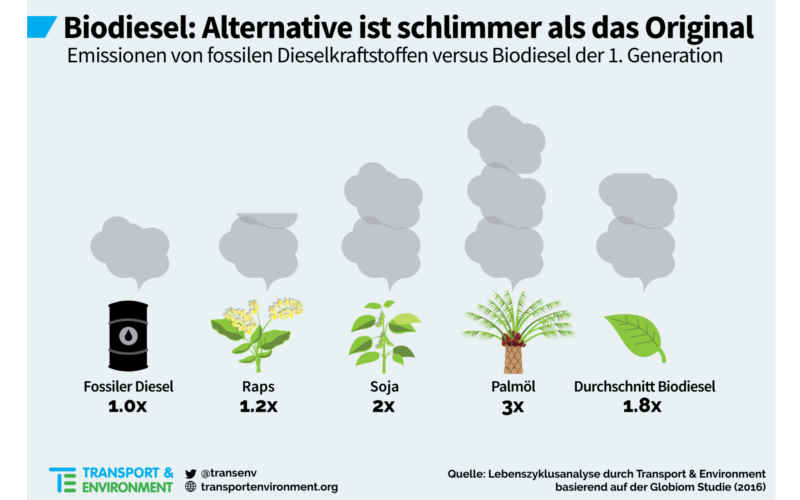 Die massive Förderung von Biokraftstoffen und damit auch von Palmöldiesel basierte auf der völlig falschen Annahme, dass Biokraftstoffe eine bessere Öko- und Klimabilanz hätten als fossile Kraftstoffe, weil es sich dabei um nachwachsende Rohstoffe handelt. Zudem wurden sie von Anfang an als kostengünstigere Alternative zu wirkungsvollen Klimaschutzmaßnahmen, wie etwa verbrauchsärmere Fahrzeuge, von der Autoindustrie und autofreundlichen Regierungen in der EU hofiert. Außen vorgelassen wird dabei die Tatsache, dass insbesondere für Agrokraftstoffe neue Flächen erschlossen werden müssen. Diese Flächen, egal ob es sich dabei um Wald oder Wiese handelt, speichern deutlich mehr Treibhausgase als eine Ackerfläche mit Pflanzen für die Kraftstoffproduktion. Das führt dazu, dass praktisch alle Biokraftstoffe aus Feldfrüchten eine schlechtere Klimabilanz aufweisen als fossile Kraftstoffe. Für Palmöl, das meist auf ehemaligen Waldflächen, oft auch auf besonders kohlenstoffreichen Torfböden angebaut wird, ist sie sogar dreimal schlechter. Viel zu langsam setzt sich die Erkenntnis durch, dass die Treibhausgasemissionen durch Landnutzungsveränderungen in die Ökobilanz von Kraftstoffen eingerechnet werden müssen.