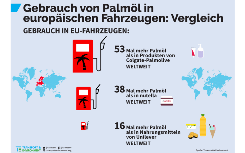 Die Verwendung von Palmöl als Kraftstoff ist ein Haupttreiber der Entwaldung in Südostasien. Besonders viel Palmöl landet in europäischen Autotanks. Seit Einführung der EU-Beimischungsquote in 2009 hat sich der Einsatz von Palmölkraftstoffen von 825.000 Tonnen auf 3,9 Mio. Tonnen in 2017 beinahe verfünffacht. Während sich die öffentliche Diskussion in den vergangenen Jahren vor allem auf die Verwendung von Palmöl in Lebensmitteln und Reinigungsmitteln konzentrierte, hat die verfehlte EU-Biokraftstoffpolitik dafür gesorgt, dass mittlerweile mehr als 50 Prozent des in die EU importierten Palmöls im Tank landet. Auch global gesehen ist der Palmöl-Hunger europäischer Kraftfahrzeuge enorm. Mittlerweile landet mehr als 16-mal so viel Palmöl in EU-Tanks als Unilever weltweit in seinen Lebensmitteln verarbeitet.