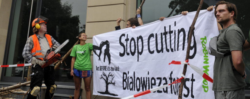 Seit Ende Mai 2017 lässt die polnische Regierung im letzten Flachland-Urwald Europas massiv Bäume fällen. Vorgeschoben wird dabei der Schutz vor Borkenkäfern. Nach einer Klage der EU-Kommission hat der Europäische Gerichtshof (EuGH) eine einstweilige Verfügung gegen weitere Fällungen in Bialowieza erlassen, doch Polen hält sich bisher nicht daran. Auch die deutliche Warnung der UNESCO, dass der Holzeinschlag eine Gefahr für den Wald und den Status als „Weltnaturerbe“ ist, stört die Regierung nicht.