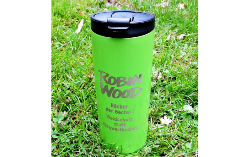 Eine schicke Alternative ist der persönliche grüne Rächer-Becher von ROBIN WOOD. Er ist doppelwandig, innen und außen aus Edelstahl, in frischem Grün lackiert mit dezenter Gravur „ROBIN WOOD – Rächer der Becher!“ und dem Zusatz „Waldschutz statt Wegwerfbecher!“. Da er komplett dicht ist, können damit schwappfrei 350 Milliliter Kaffee und Tee, aber auch kühle Getränke durch die Gegend transportiert werden. Zum Herstellungspreis von 12 € zu bestellen im ROBIN WOOD-Shop unter:/shopde/special/r%c3%a4cher-becher