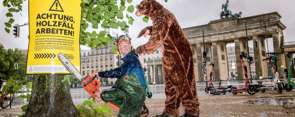 Am 1. Juli setzten wir noch einen drauf und realisierten eine Plakataktion zeitgleich in mehr als 15 europäischen Städten. Wir hängten Warnschilder an Bäume vor Sehenswürdigkeiten, wie dem Eiffelturm, dem Wiener Riesenrad oder dem Hauptsitz der EU-Kommission. ROBIN WOOD war an diesem Tag im strömenden Regen, aber gut gelaunt in Berlin vor dem Brandenburger Tor. Mehr als 1000 Mal wurden an diesem Tag Fotos mit dem Hashtag #StopFakeRenewables getwittert: „Holzbiomasse muss aus der EU-Richtlinie für Erneuerbare Energien gestrichen werden!“ In Deutschland schaffte es der Hashtag sogar in die Twittercharts des Tages. Noch bis zum 14. Juli sammelten wir weitere Bilder. Diese Aktion zeigte uns auf eindrückliche Weise, dass Protest uns über Ländergrenzen hinweg verbindet und viel Spaß machen kann, so dramatisch das Thema auch ist.