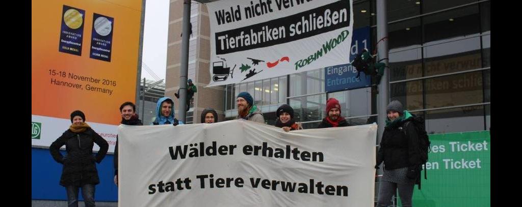 Unser hoher Fleischkonsum setzt die Wälder weltweit unter Druck. Im globalen Süden wird Urwald vernichtet, um Tierfutterpflanzen wie Soja und Ölpalmen anzubauen. Hier in Deutschland leidet der Wald, weil er den riesigen Überschuss an stickstoffhaltigen Verbindungen in Luft und Boden nicht verträgt. ROBIN WOOD ist dagegen aktiv geworden und hat bei der Messe EuroTier in Hannover spektakulär protestiert.