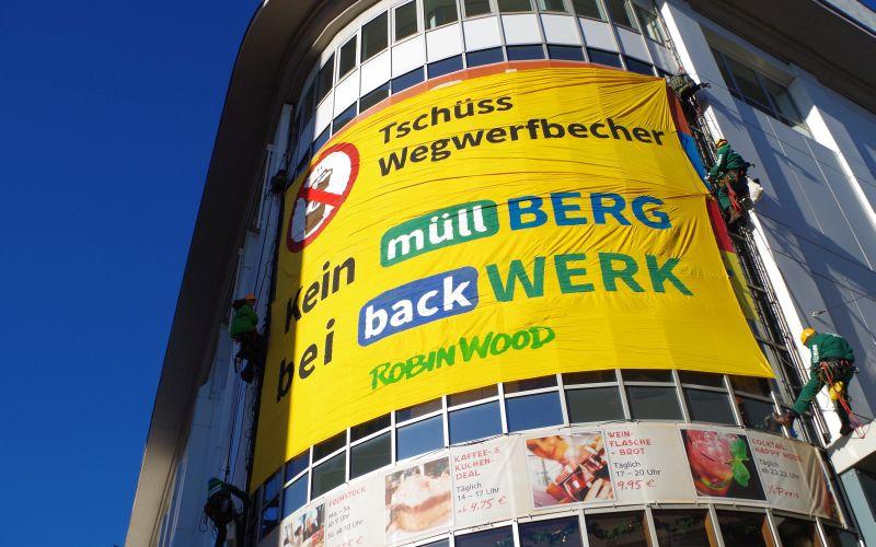 Unter Druck sind die Wälder auch, weil immer mehr Menschen zu Wegwerfbechern greifen. Gegen diese riesige, überflüssige Verschwendung ist ROBIN WOOD mit Ihrer Hilfe aktiv geworden. Im Sommer 2016 hat ROBIN WOOD die Kampagne „Kein MüllBERG bei BackWERK“ gestartet, nachdem die Discount-Bäckereikette auf Anfragen zum Thema nicht reagiert hatte. Es gab bundesweit Aktionen vor den Filialen und gleichzeitig wurden von unseren Aktiven und FörderInnen insgesamt 4286 Unterschriften gesammelt, um BackWerk zum Umdenken zu bewegen.