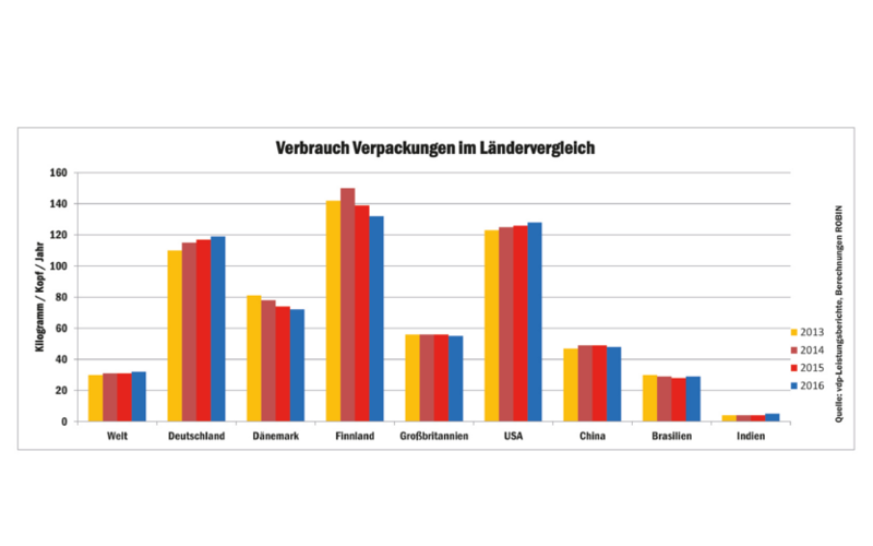 Papier, Pappe und Kartonagen haben mit Abstand den größten Anteil am Verpackungsaufkommen. Vor allem durch den Boom im Versandhandel und bei To-go-Angeboten wächst der Berg an Verpackungen rasant. In Deutschland hat sich der Verbrauch an Papier-Verpackungen in den vergangenen dreißig Jahren verdoppelt. Zwischen 2013 und 2017 stieg er hierzulande um zwölf Prozent, während andere Industrieländer wie Dänemark ihren ohnehin deutlich geringeren Verbrauch an Papierverpackungen sogar senkten.