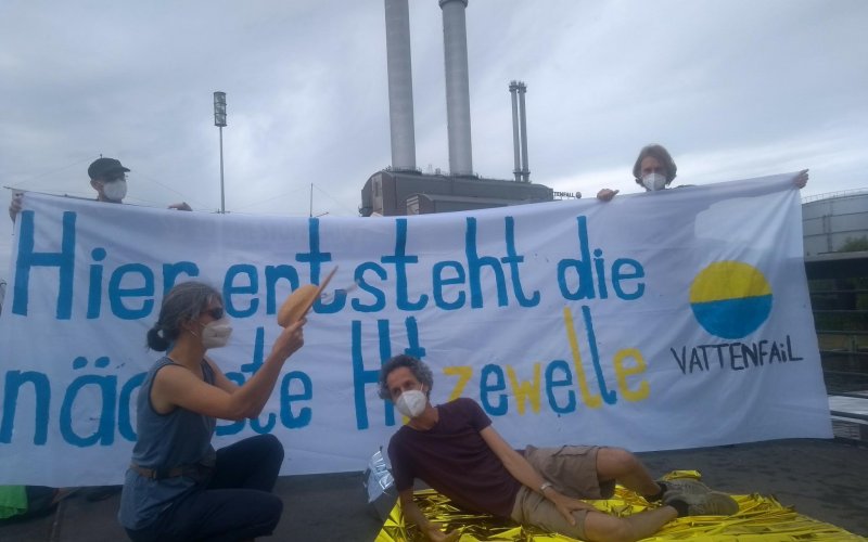 Heute hat das Bündnis GasExit gemeinsam mit ROBIN WOOD vor dem Erdgaskraftwerk in Berlin-Mitte für einen zügigen Erdgasausstieg protestiert. Unter dem Motto „Hier entsteht die nächste Hitzewelle“ zogen ca. 30 Menschen vor das Vattenfall-Schild „Hier kann man der Energiewende bei der Arbeit zuschauen“ vor dem Heizkraftwerk Mitte. Sie saßen und lagen erschöpft am Boden und stellten Menschen dar, die unter der Hitzewelle als Folge der Klimakrise leiden, die durch die Verbrennung von Erdgas noch verschärft wird. Vattenfall warfen sie vor, die Öffentlichkeit bewusst zu täuschen.