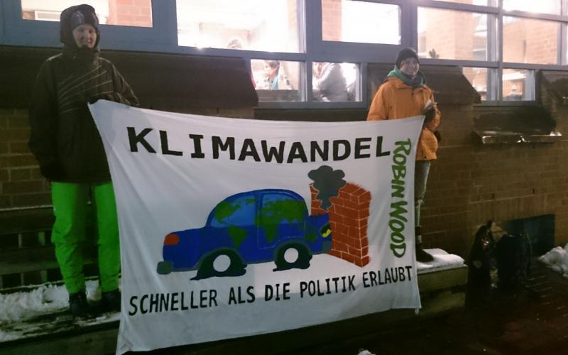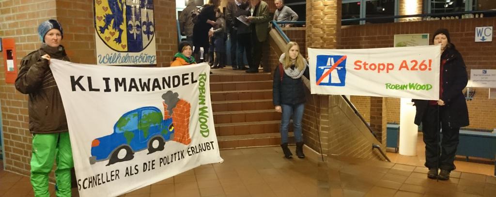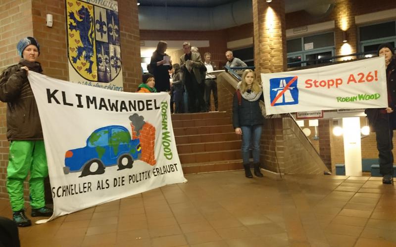 ROBIN WOOD-Aktive haben heute Abend im Bürgerhaus Wilhelmsburg gegen den geplanten Bau der Autobahn A 26-Ost im Hamburger Süden protestiert. Auf Transparenten forderten sie „Stopp A 26“. Mit dem Slogan „Klimawandel, schneller als die Politik erlaubt“ machten sie zudem auf die Klimaschäden durch immer mehr Verkehr und neue Autobahnen aufmerksam.