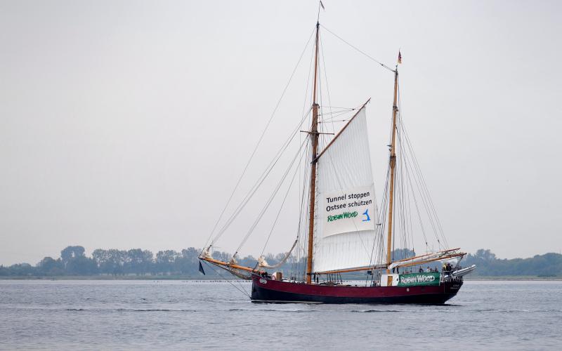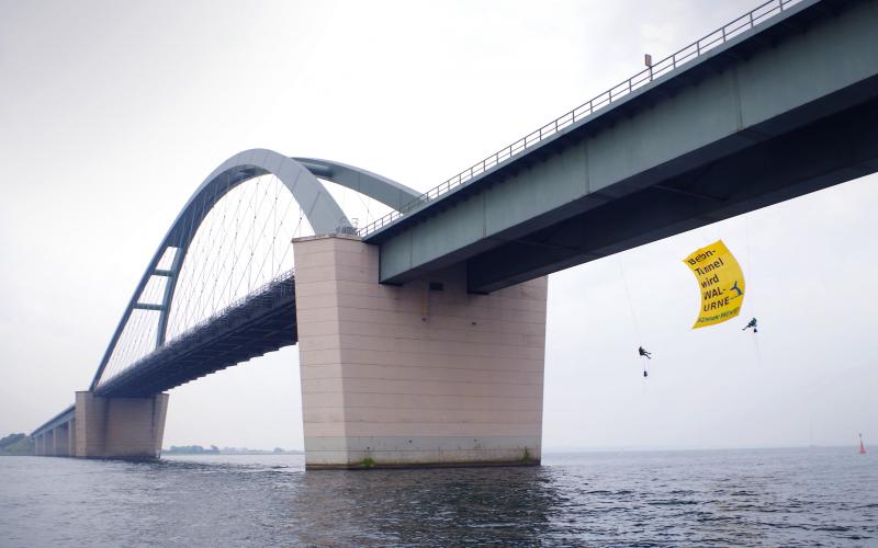 Aus Protest gegen die geplante Untertunnelung des Fehmarnbelts in der Ostsee haben sich ROBIN WOOD-AktivistInnen heute Vormittag von der Fehmarnsundbrücke zwischen dem schleswig-holsteinischen Festland und der Insel Fehmarn abgeseilt. Sie spannten dort ein Transparent mit der Aufschrift „Beton-Tunnel wird WAL-URNE“. Begleitet wird die Aktion vom Traditionssegler LOVIS, der ein Banner mit dem Slogan „Tunnel stoppen – Ostsee schützen“ hisste. Auch VertreterInnen des Bündnisses Beltretter sind vor Ort. ROBIN WOOD fordert einen Verzicht auf den Bau einer Festen Fehmarnbeltquerung und die Beibehaltung der Fährverbindung.