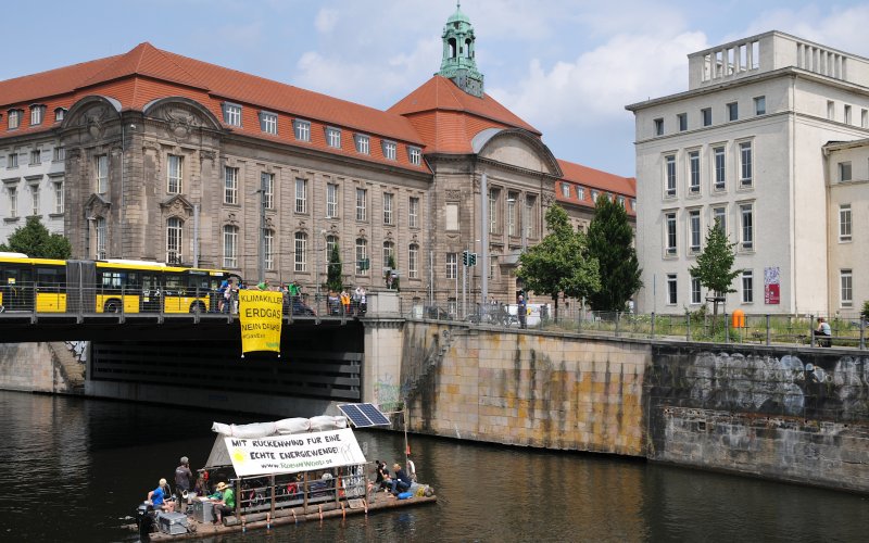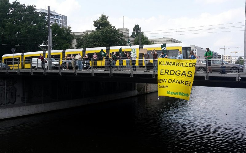 Als das Holzfloß ROBINA WALD heute Mittag auf dem Berlin-Spandauer Schifffahrtskanal kreuzte, entrollten weitere Aktivist*innen von ROBIN WOOD und Fridays For Future an der Sandkrugbrücke am Bundeswirtschaftsministerium ein Banner mit dem Slogan: „Klimakiller Erdgas – Nein Danke! #GasExit“