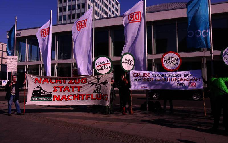 Berlin, 19. März 2015. Heute präsentiert Bahn-Chef Rüdiger Grube im Berliner Congress Centrum (BCC) am Berliner Alexanderplatz die Bilanz der Deutschen Bahn AG für das Geschäftsjahr 2014. Aktive vom Bündnis Bahn für Alle setzen vor dem BCC ihre Sicht auf das Bahnjahr 2014 in Szene. Mit einem Transparent mit der Aufschrift „Nachtzug statt Nachtflug“ fordern sie von der DB AG, mit Nachtzügen weiter eine klimafreundliche Alternative zu innereuropäischen Flügen anzubieten. Auf einem anderen Transparent steht „Grube verabschiedet sich vom Brot- und Buttergeschäft der Bahn“. Mit Butterstullen erinnern die Aktiven Rüdiger Grube an sein Versprechen bei Amtsantritt vor sechs Jahren, statt Privatisierungskurs wieder dem „Brot- und Buttergeschäft“ der DB AG Vorrang zu geben.