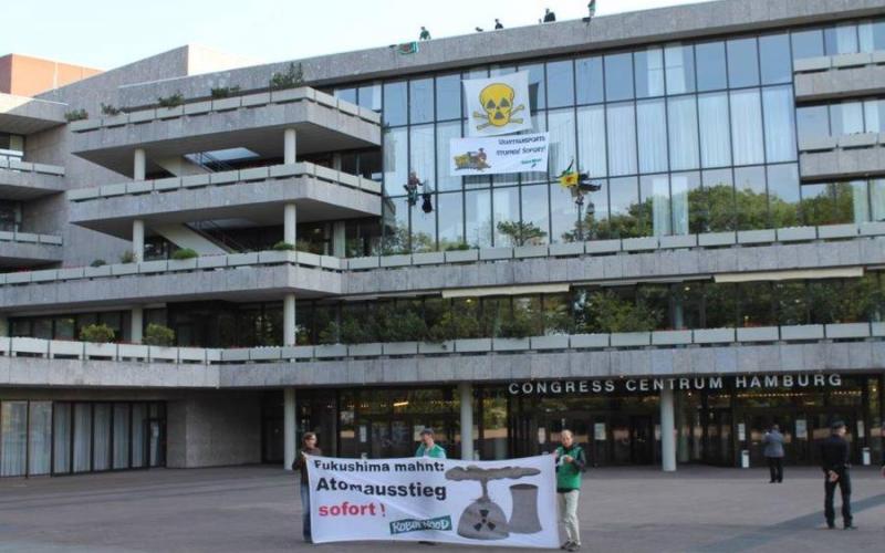 ROBIN WOOD-AktivistInnen demonstrieren heute gegen die Jahrestagung Kerntechnik des Deutschen Atomforums, die am Morgen im Hamburger Congress Center (CCH) beginnt. Zwei KletterInnen seilten sich vom Dach ab, entrollten an der Fassade Banner mit einem Atom-Totenkopf und dem Slogan "Urantransporte stoppen! Sofort!" und protestieren so gegen das Treiben der Atomlobby. Sie fordern die sofortige Stilllegung aller Atomanlagen, den Stopp sämtlicher Atomtransporte, die vollständige Kostenübernahme der Energiekonzerne für die Abwicklung der Atomindustrie und die Aufklärung von Verstrickungen zwischen Politik und Atom-Lobby.