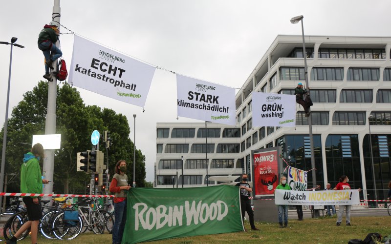 Vor Ort präsentieren ROBIN WOOD und Watch Indonesia! eine mobile Ausstellung mit großformatigen Postern und Informationen zu Umwelt- und Menschenrechts-Freveln von HeidelbergCement. Zudem entrollten Kletter*innen zwischen Masten gegenüber vom Hauptsitz des Unternehmens drei Protestbanner mit den Slogans „ECHT katastrophal! STARK klimaschädlich! GRÜN-washing!“ – eine Anspielung auf einen Werbespruch von HeidelbergCement. Auch auf der indonesischen Insel Java protestierten Menschen gegen die Naturzerstörung für die Zementproduktion von HeidelbergCement. ROBIN WOOD und Watch Indonesia! fordern von dem Zementhersteller eine verantwortliche Produktion, die den Anforderungen an Klimaschutz gerecht wird und menschenrechtliche Sorgfaltspflichten erfüllt. Alle Proteste berücksichtigten die aktuellen Vorgaben zum Infektionsschutz.