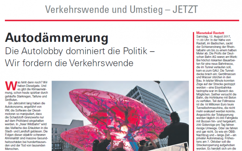 Die jahrelangen Abgas-Manipulationen bei Dieselmotoren verursachen schwere Gesundheitsschäden bei Hunderttausenden und den Tod von tausenden Menschen. Die beschlossenen Software-Updates für Dieselmotoren seien nahezu wirkungslos. „Keine der Parteien, die nach dem 24. September für die neue Regierungskoalition in Frage kommen, will diese kriminelle Verkehrspolitik beenden“, kritisiert Dr. Winfried Wolf von der Expertengruppe „Bürgerbahn statt Börsenbahn“. „Das Auto – Pkw und Lkw – soll weiter dominieren.“