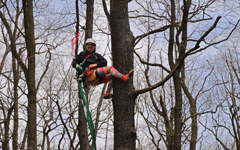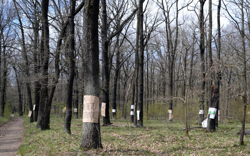 Am heutigen internationalen „Tag des Baumes“, protestieren ROBIN WOOD-Aktive gemeinsam mit einem breiten Bündnis von Umweltgruppen gegen den Bau der Tangentialverbindung Ost (TVO) durch die Wuhlheide im Berliner Südosten. Eine Fahrraddemonstration startete am Mittag ab dem S-Bahnhof Wuhletal, eine Demo ab S-Bahnhof Spindlersfeld. ROBIN WOOD-Aktivist*innen beteiligten sich unter dem Motto „Wer Straßen sät, wird Verkehr ernten“ mit einer Kletteraktion über der geplanten vierspurigen Trasse der TVO. Dafür spannten sie ein drei mal fünf Meter großes Transparent in die Bäume, die für den Bau der Schnellstraße zerstört werden sollen. Am Boden wurde zudem mit Flatterband die geplante Trasse markiert.