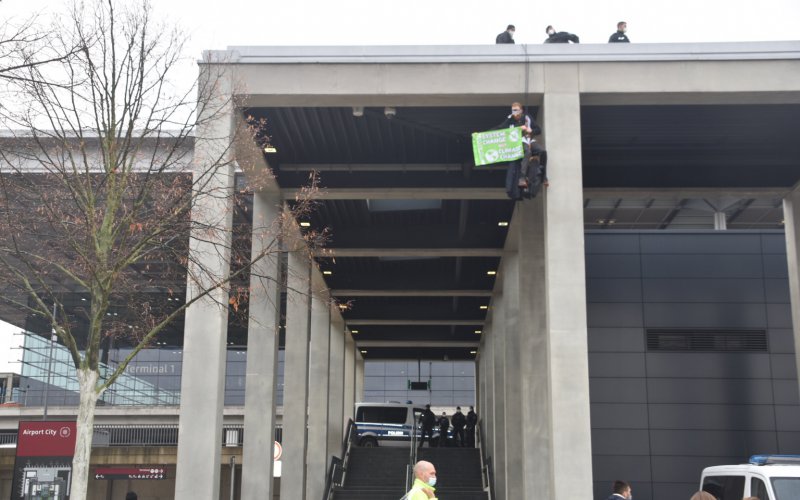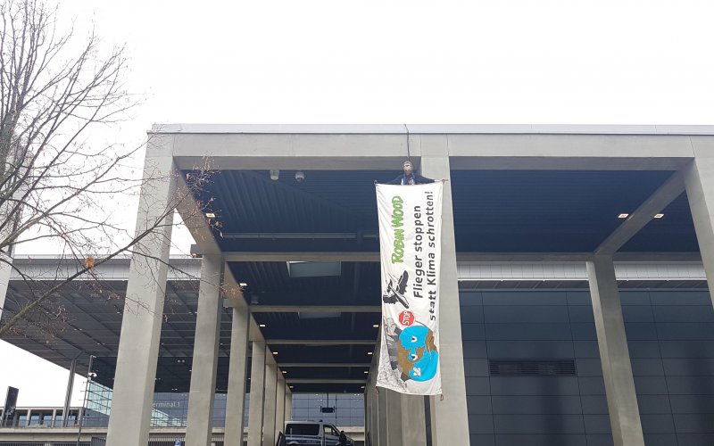 ROBIN WOOD-Aktivist*innen protestieren heute gegen die Eröffnung des Flughafen Berlin-Brandenburg (BER). Sie entrollten am Vormittag vom Dach eines Gebäudes direkt vor dem Terminal 1 am Willy-Brandt-Platz Banner mit den Aufschriften "Flieger stoppen statt Klima schrotten" und "System Change not Climate Change". ROBIN WOOD fordert den Ausbaustopp für Flughafeninfrastruktur sowie eine konsequente Förderung klimafreundlicher Alternativen zum Flugverkehr. Der Protest geht Hand in Hand mit zahlreichen Demonstrationen und Aktionen weiterer Akteur*innen der Klimagerechtigkeitsbewegung, die heute anlässlich der BER-Eröffnung stattfinden.