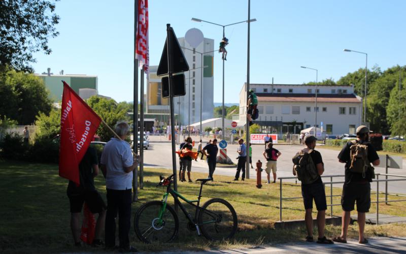 Anlässlich der 150-Jahr-Feier des Gipsabbau-Unternehmens Casea – einem Zusammenschluss der Südharzer Gipswerke – bekam das Unternehmen in Ellrich (Landkreis Nordhausen) heute Besuch von Umweltschützer*innen. Um gegen die Naturzerstörung der ökologisch wertvollen Karstlandschaft im Südharz für Gips zu protestieren, hissten Aktive von ROBIN WOOD und den NaturFreunden Banner an drei Fahnenmasten an der Einfahrt des Unternehmens und beflaggten damit das Unternehmen neu. Auf den Bannern griffen sie das Motto des Unternehmens „Im Namen der Zukunft“ auf und ergänzten es durch die Slogans „Recycling statt Raubbau!“ und „150 Jahre Artensterben sind genug!“.
