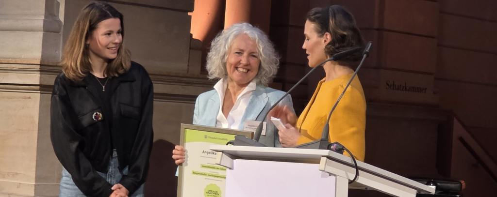 ROBIN WOOD gratuliert der Umwelt-Heldin Angelika Linckh und freut sich riesig mit ihr über die Auszeichnung ihres herausragenden Engagements für Klimaschutz, lebenswerte Städte und eine umweltfreundliche Mobilitätswende. Die Deutsche Umwelthilfe hatte ihr sowie zwei weiteren Preisträger*innen am 12. März 2026 in Berlin den Bürgerschafts- und Engagementpreis „DRUCK MACHEN – Für die Umwelt!” verliehen.