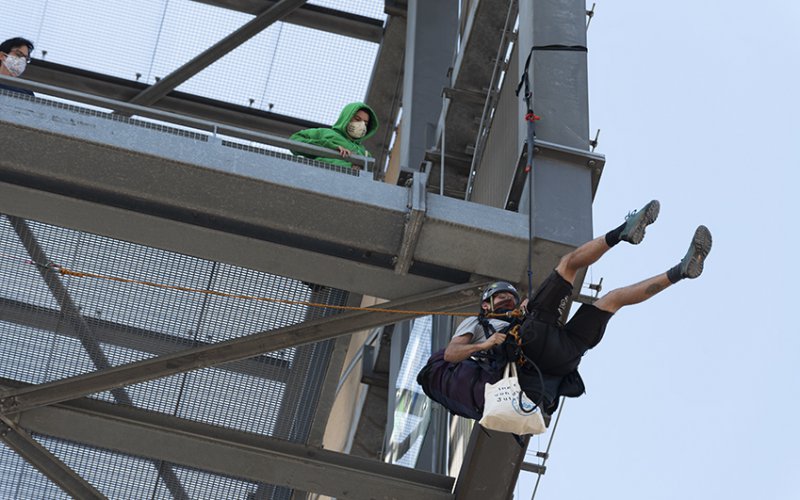 „Ich will Dörfer – keine Kohle!“ – diese Forderung legten ROBIN WOOD-Aktivist*innen heute bei einer Kletteraktion dem sogenannten Indemann im rheinischen Braunkohlerevier in den Mund. Dazu entrollten sie eine große Sprechblase an dem 36 Meter hohen Aussichtsturm, einer Stahlkonstruktion in Menschengestalt. Der Turm steht am Tagebau Inden, in dem RWE noch weitere neun Jahre Braunkohle abbauen will. Die Aktivist*innen solidarisieren sich mit den aktuellen Protesten gegen die Zerstörung der vom Braunkohletagebau bedrohten Dörfer. ROBIN WOOD fordert von der NRW-Landesregierung einen Umsiedlungsstopp und eine Energiepolitik im Sinne des Allgemeinwohls und des Klimaschutzes.