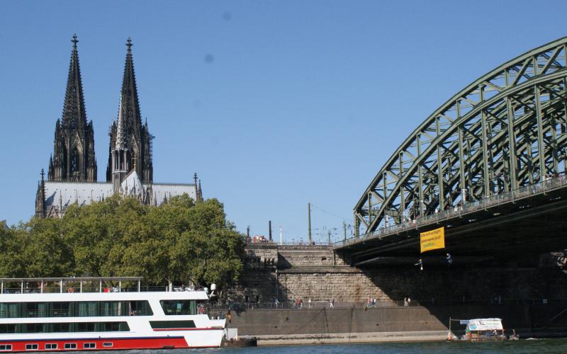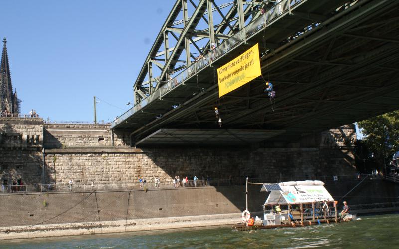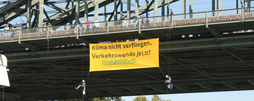 Heute Vormittag haben sich zwei ROBIN WOOD-Aktivist*innen an der Hohenzollernbrücke in Köln abgeseilt, um dort ein Banner aufzuspannen mit der Aufschrift „Klima nicht verfliegen – Verkehrswende jetzt“. Damit machen sie darauf aufmerksam, dass der Flugverkehr als klimaschädlichste Fortbewegungsart die Zukunft unseres Planeten enorm gefährdet. ROBIN WOOD fordert zum Schutz von Klima, Menschen und Umwelt, die Flugbewegungen drastisch zu reduzieren, auf den Ausbau von Flughäfen zu verzichten und für mehr Kostengerechtigkeit im Verkehr zu sorgen.