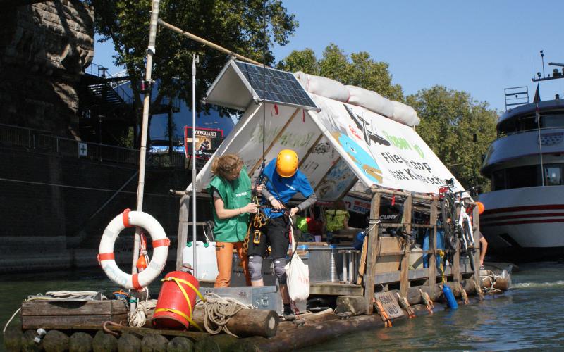 Aktivist*innen der Umweltorganisation sind zurzeit mit einem Holzfloß unter dem Motto „Flieger stoppen, statt Klima schrotten“ auf Main und Rhein unterwegs. Das Floß startete in Frankfurt und ist nun an der letzten Station in Köln angekommen, wo es bis Sonntag zur Floßbesichtigung einlädt.