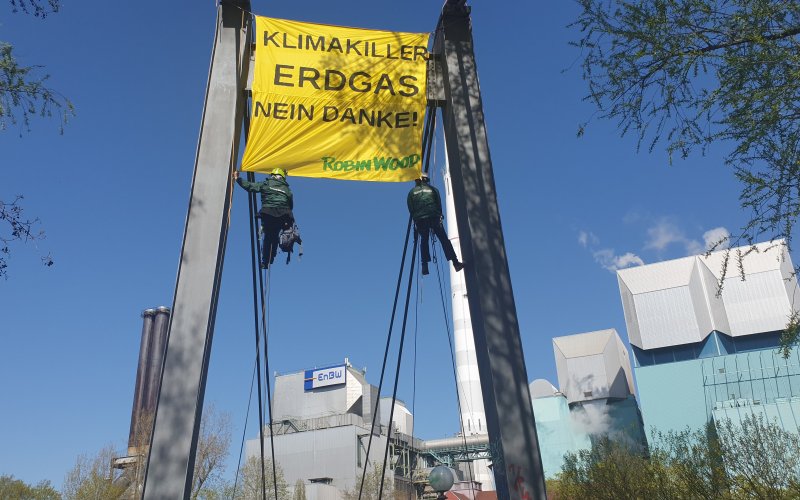 Mit einer Kletteraktion haben Aktivist*innen der Umweltschutzorganisation ROBIN WOOD heute Vormittag gegen die Pläne des Energiekonzerns EnBW protestiert, das Kraftwerk Stuttgart-Münster auf den Betrieb mit Erdgas umzurüsten. In Sichtweite des Kraftwerks spannten die Aktivist*innen ein Banner mit der Aufschrift „Klimakiller Erdgas – Nein Danke!“ über eine Fußgängerbrücke. Die Aktion findet anlässlich der heute digital abgehaltenen Besprechung des Regierungspräsidiums Stuttgart zu den Umrüstungsplänen des Energieversorgers statt. ROBIN WOOD fordert das Regierungspräsidium und die Stadt Stuttgart auf, sich gegen die Umrüstung auszusprechen und kündigt weitere Proteste an.