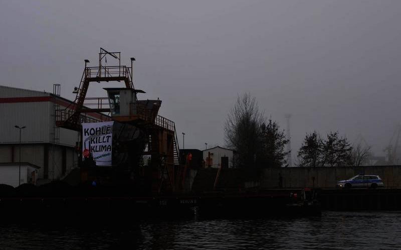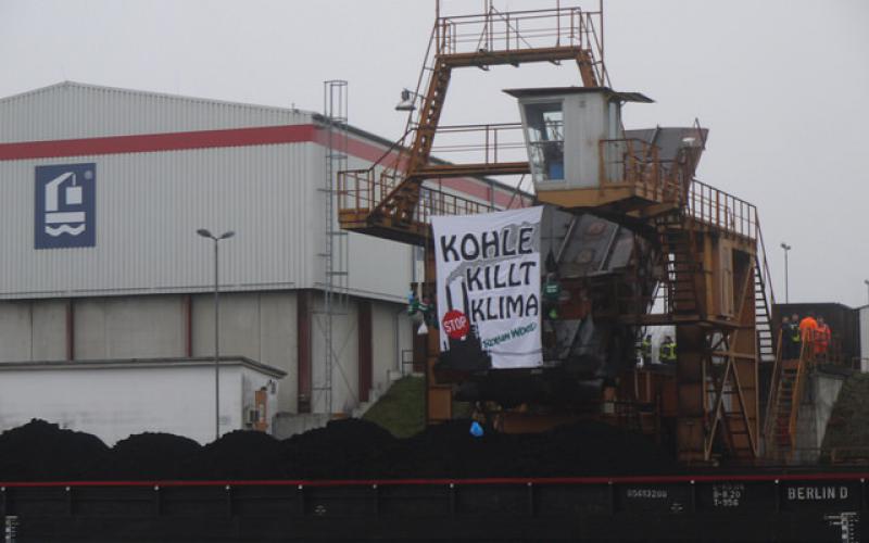 AktivistInnen von ROBIN WOOD und aus unabhängigen Zusammenhängen halten seit den frühen Morgenstunden eine Kipp- und Krananlage des Berliner Binnenhafens in Königs Wusterhausen (Brandenburg) besetzt. An dem Kran befestigten sie ein Banner mit der Aufschrift „Kohle killt Klima“. Sie fordern von der Landesregierung in Berlin den Ausstieg aus der Kohleverstromung und vom Energiekonzern Vattenfall das Ende des desaströsen Kohletagebaus in der Lausitz – anstatt des geplanten Verkaufs der Braunkohlesparte. Die AktivistInnen unterstützen damit den vielfältigen Braunkohle-Widerstand in der Region. In Königs Wusterhausen wird Braunkohle aus der Lausitz für das Vattenfall-Heizkraftwerk Klingenberg in Berlin verladen.