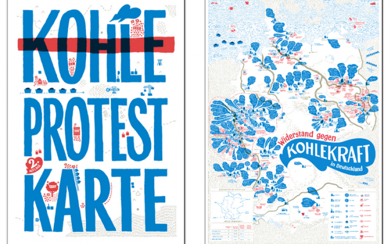 Die Kohle-Protest-Karte ist eine Mischung aus Infografik und Wimmelbild. Informativ und ästhetisch ansprechend stellt sie die Nutzung der Kohle in der BRD dar – darunter die Tagebaue, Zechen, Bestandskraftwerke und Kraftwerksplanungen – und stellt dem die vielfältigen Proteste seit dem Jahr 2008 gegenüber. BetrachterInnen finden so Antworten auf Fragen wie: Wo stehen die klimaschädlichsten Kohlekraftwerke? Welche Kapazität an Gaskraftwerken steht bundesweit still? Wann fanden wo Klimacamps statt? Wie viele Tagebaue existieren in Deutschland und wie viele Menschen wurden ihretwegen umgesiedelt?