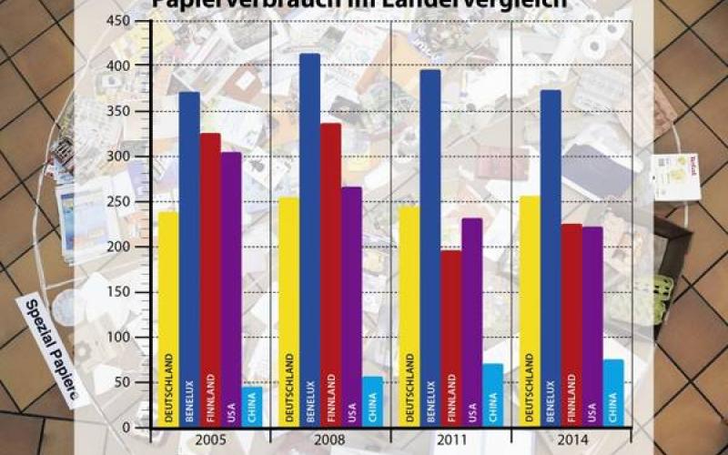 Deutschland ist – nach Belgien/Luxemburg – der zweitgrößte Papierverschwender weltweit. 258 Kilogramm Papier pro Kopf wurden im Jahr 2015 hierzulande verbraucht. Das waren 2,8 Prozent mehr als im Vorjahr. Damit hat Deutschland die dringend notwendige Wende hin zu einem sparsamen Umgang mit Papier nicht einmal im Ansatz geschafft. ROBIN WOOD fordert zum Schutz von Wäldern und Klima, den Papierkonsum mindestens zu halbieren.