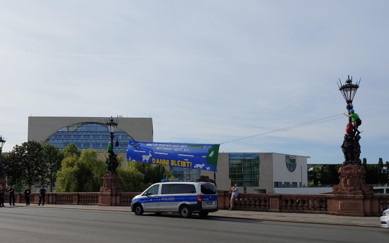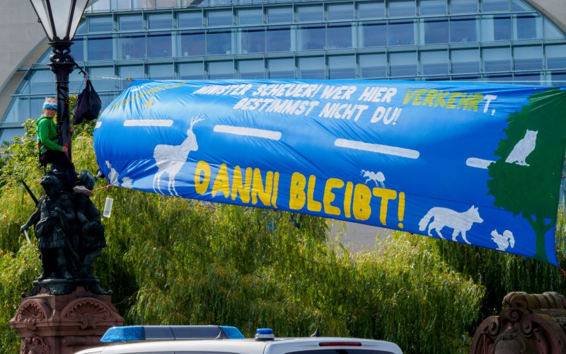 Anlässlich des heutigen Autogipfels in Berlin protestieren ROBIN WOOD-Aktivist*innen gegen die klimafeindliche Verkehrspolitik der Bundesregierung. Sie fordern, die Zerstörung von Wäldern für den Ausbau von Autobahnen zu stoppen. Kletter*innen spannten zwischen zwei Laternenpfeilern auf der Moltkebrücke in Sichtweite des Kanzleramts am Morgen ein Banner mit der Aufschrift: „Minister Scheuer! Wer hier verkehrt, bestimmst nicht du! Danni bleibt“. Der Protest richtet sich insbesondere gegen die geplante Rodung des Dannenröder Waldes für den Ausbau der Autobahn 49 zwischen Stadtallendorf und Gemünden (Felda) in Hessen.