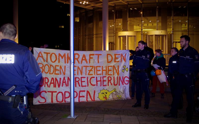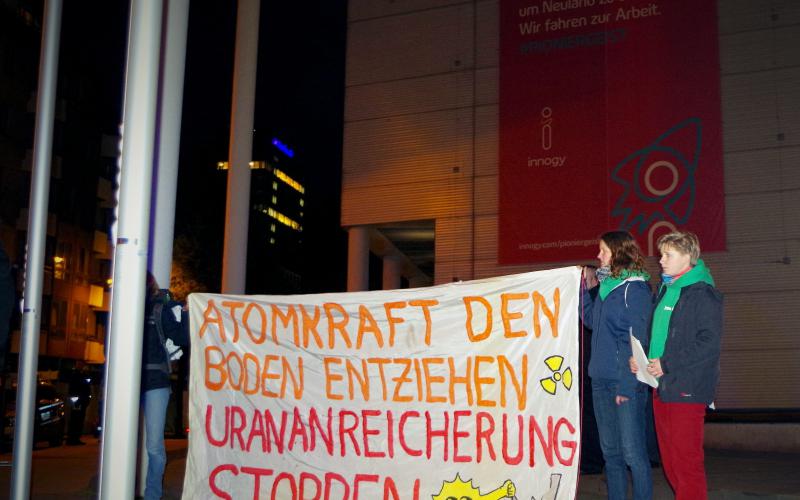 Eine Versammlung von AktivistInnen von ROBIN WOOD und dem Aktionsbündnis „Münsterland gegen Atomanlagen“ vor der RWE-Zentrale am Opernplatz in Essen wurde bereits am frühen Morgen durch einen gewaltsamen Security-Einsatz der von RWE beauftragten Firma SDL beendet, wobei eine schwerbehinderte AktivistIn verletzt wurde. Den AktivistInnen gelang es jedoch, ein Banner mit der Aufschrift „Atomkraft den Boden entziehen – Urananreicherung stoppen“ zu entrollen.