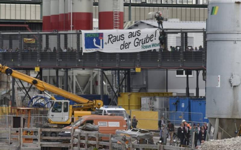 Kletterprotest bei der inszenierten Grundsteinlegung für den Tiefbahnhof