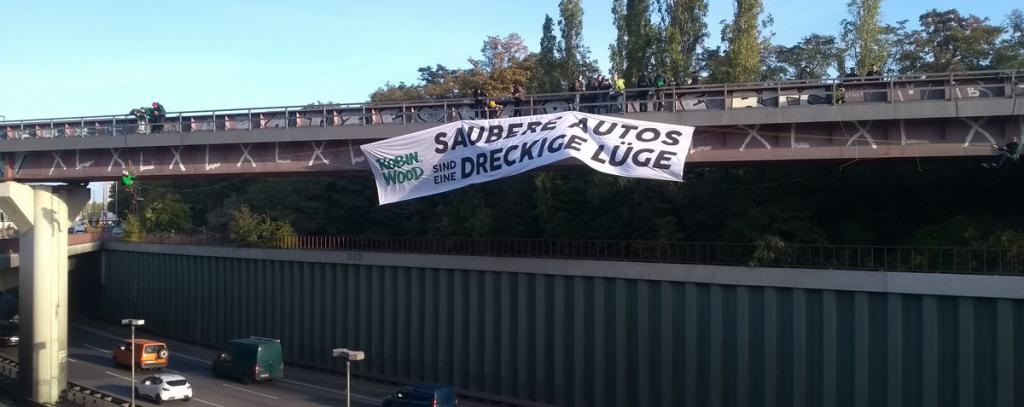 Aus Solidarität mit dem heutigen internationalen Klimastreiktag von Fridays for Future haben sich am Morgen gegen 7:30 Uhr zwei ROBIN WOOD-Aktivist*innen an einer Eisenbahnbrücke über der Stadtautobahn A100 in Berlin-Tempelhof mit einem Transparent abgeseilt. Darauf ist zu lesen: „SAUBERE AUTOS SIND EINE DRECKIGE LÜGE“. Damit protestieren sie gegen den motorisierten Individualverkehr. Obwohl der erheblich zur Klimakrise beiträgt, setzt die Verkehrspolitik in Berlin und im Bund weiterhin voll auf Auto und LKW, während die Infrastruktur für öffentliche Verkehrsmittel zunehmend verfällt und Bus und Bahn insbesondere in Berlin immer unzuverlässiger werden.