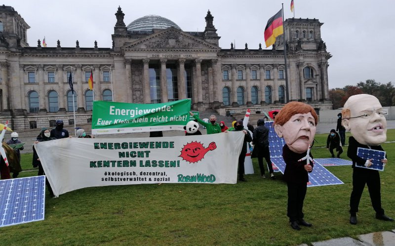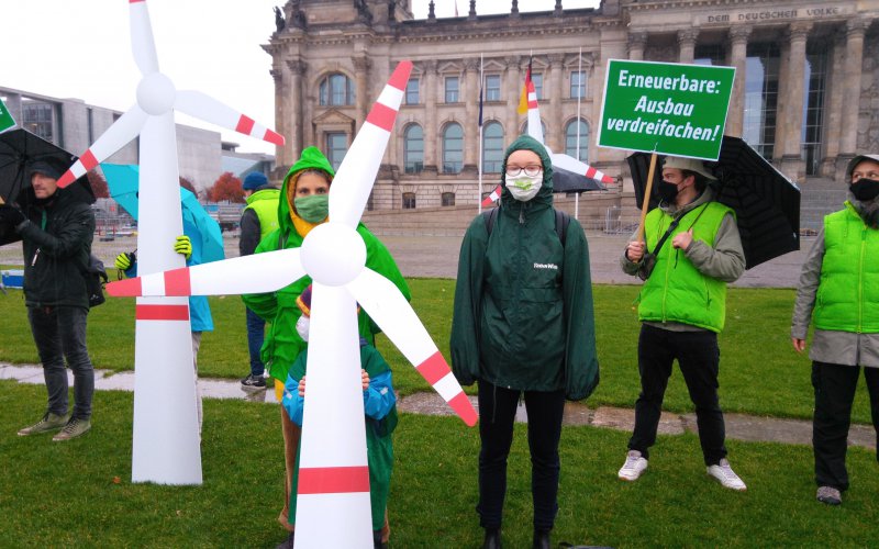 Ein Bündnis aus Umweltverbänden hat die erste Lesung zur Novelle des Erneuerbaren-Energie-Gesetzes im Bundestag auf der Reichstagswiese mit einer bildstarken Protestaktion begleitet. Protestierende in Merkel- und Altmaier-Masken, ausgerüstet mit winzigen Windrädern und Solarmodulen, standen Aktivistinnen und Aktivisten mit großen Solarpaneelen und bis zu drei Meter hohen Windrädern gegenüber. Nach Ansicht der Verbände reicht die EEG-Novelle, die schon am 1.1.2021 das alte EEG ersetzen soll, bei weitem nicht aus, um der Klimakrise zu trotzen. Der geplante Ausbau von Sonnen- und Windkraft ist zu niedrig ausgelegt.