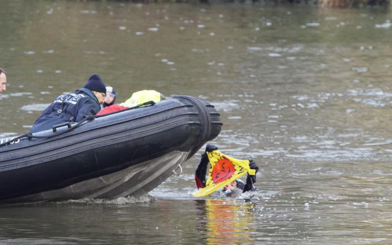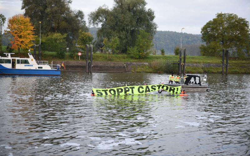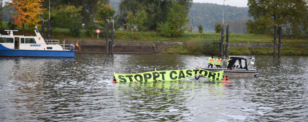 Anti-Atom-AktivistInnen protestieren heute gegen den dritten CASTOR-Transport auf dem Neckar. In der Nähe der Schleuse Gundelsheim (Landkreis Heilbronn) haben sich am Morgen vier SchwimmerInnen ins Wasser begeben und dort ein „Stoppt CASTOR!“-Banner hochgehalten. ROBIN WOOD fordert den Energiekonzern EnBW sowie die Landesregierung auf, die unsinnige und gefährliche Atommüll-Verschieberei auf dem Neckar zu stoppen. Außerdem sollen sie die Produktion weiteren Atommülls unterlassen und ein schlüssiges Konzept für den Umgang mit den strahlenden Hinterlassenschaften der Atomindustrie vorlegen. Heute früh ist der dritte von insgesamt fünf geplanten Schiffstransporten mit hochradioaktivem Atommüll von Neckarwestheim nach Obrigheim gestartet. Mit der Aktion unterstützen die AktivistInnen Proteste des Bündnisses Neckar castorfrei.