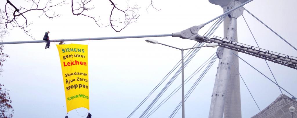 Während der Jahreshauptversammlung von Siemens protestieren AktivistInnen von Robin Wood heute Vormittag an der Olympiahalle in München gegen die Verstrickungen des Konzerns in Menschenrechtsverletzungen und Landraub für das Kraftwerk Agua Zarca in Honduras sowie weitere Energieprojekte in Ländern des globalen Südens.