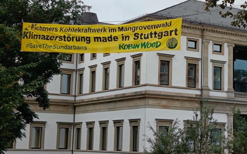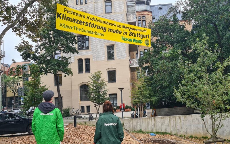 „Klimazerstörung made in Stuttgart – Kein Kohlekraftwerk im Mangrovenwald“ – ein Banner mit dieser Aufschrift haben ROBIN WOOD-Aktivist*innen am Morgen zwischen zwei Bäumen vor dem Stadtpalais in Stuttgart gespannt. Dort finden heute die so genannten „Fichtner-Talks“ statt. Das Ingenieur- und Planungsbüro Fichtner unterstützt den Neubau von zwei Kohlekraftwerken in Bangladesch u.a. mit Beratungsleistungen. Der Hauptsitz des Unternehmens mit Niederlassungen in mehr als 60 Ländern liegt in Stuttgart.