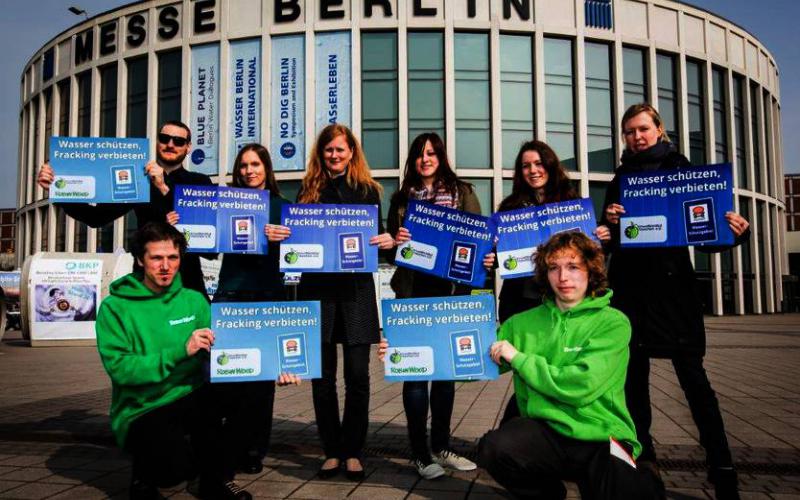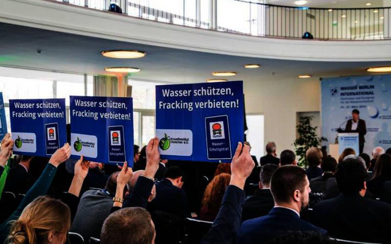 Berlin, 24. März 2015 - Die Eröffnungsrede von Bundesumwelt-ministerin Barbara Hendricks auf der Fachmesse Wasser Berlin International nutzten Aktivistinnen und Aktivisten von ROBIN WOOD und des Umweltinstituts München heute für Proteste gegen die Einführung der Fracking-Technologie. Auf Schildern forderten sie Wasser schützen, Fracking verbieten!.