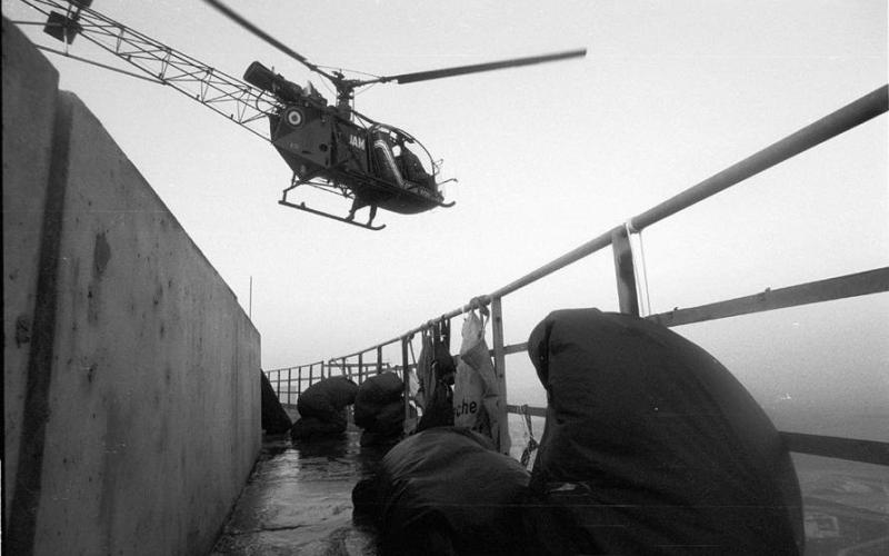 Viermal wurden die Kühlturmbesetzer von Hubschraubern aus attackiert und mit einem Benzin-Wasser-Reizgas-Gemisch besprüht. Die Besatzung des Hubschraubers trug Gasmasken. Um 19.30 Uhr, als eine gewaltsame Räumung des Kühlturms von der Polizei angedroht wurde, entschieden sich die Umweltaktivisten zum Abstieg.